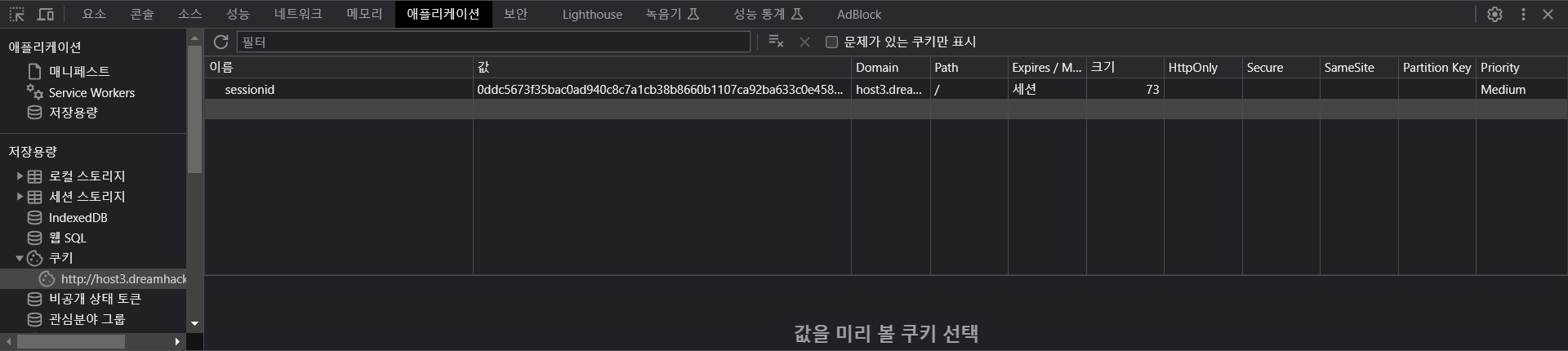 개발자도구를 통해 쿠키에 접근해 보았다. guest 계정의 sessionid 값이 저장되어 있었다.