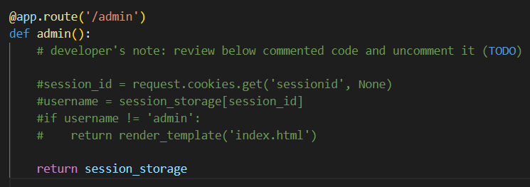 3. 소스코드를 더 읽어봤더니 아래에 '/admin' 경로가 있다. 여기에서 session storage를 반환하는 코드를 발견했다.