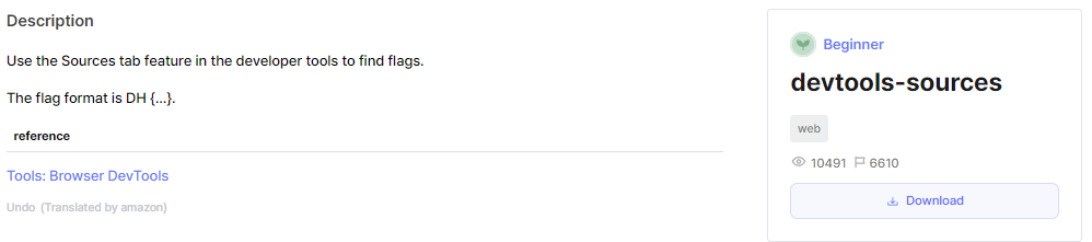 개발자 도구의 Sources 탭 기능을 활용해 플래그를 찾아보세요. 플래그 형식은 DH{...} 입니다. Reference Tools: Browser DevTools