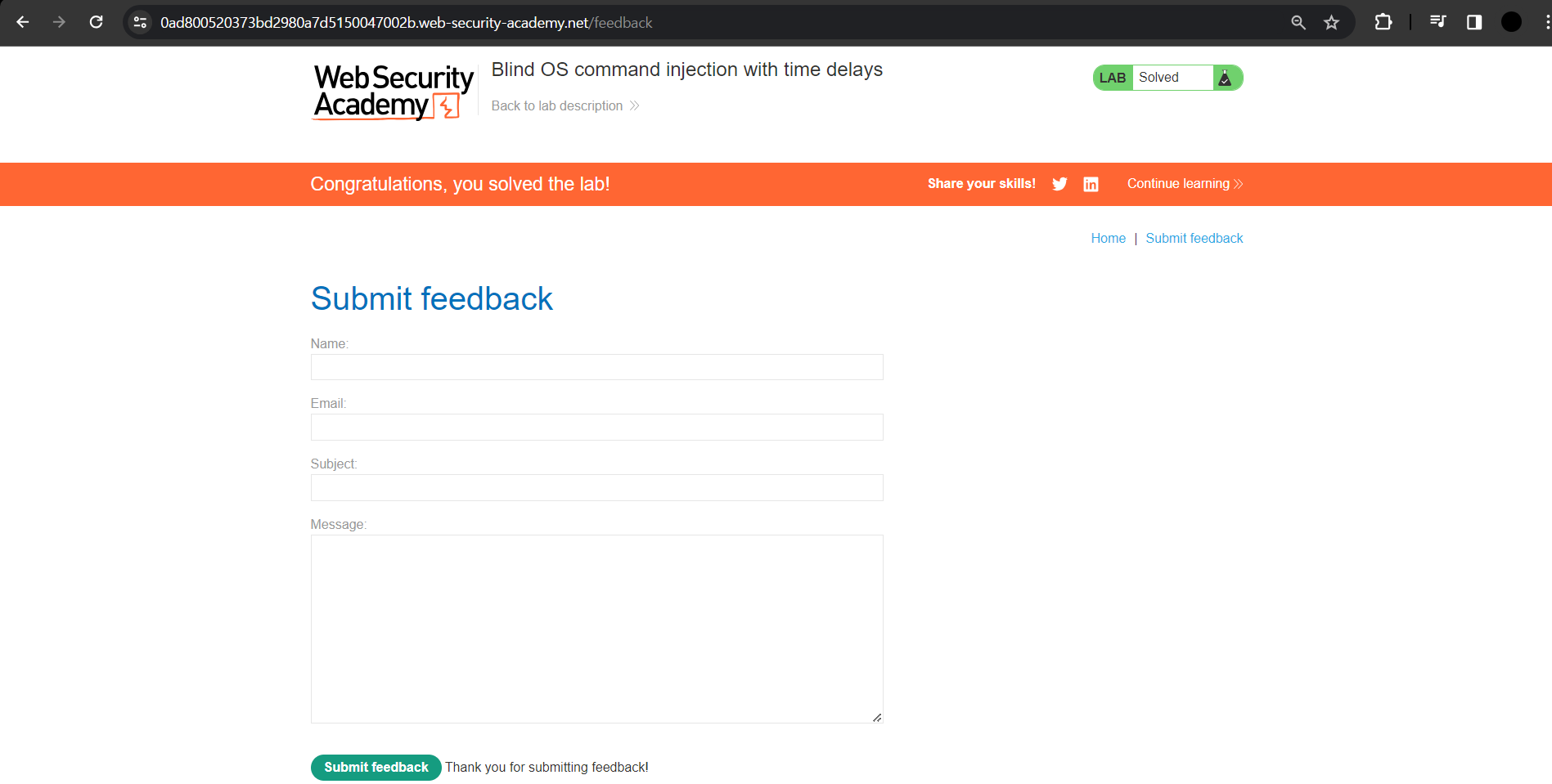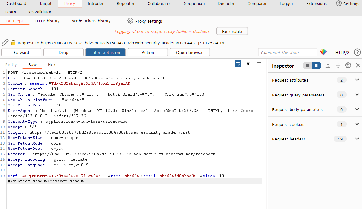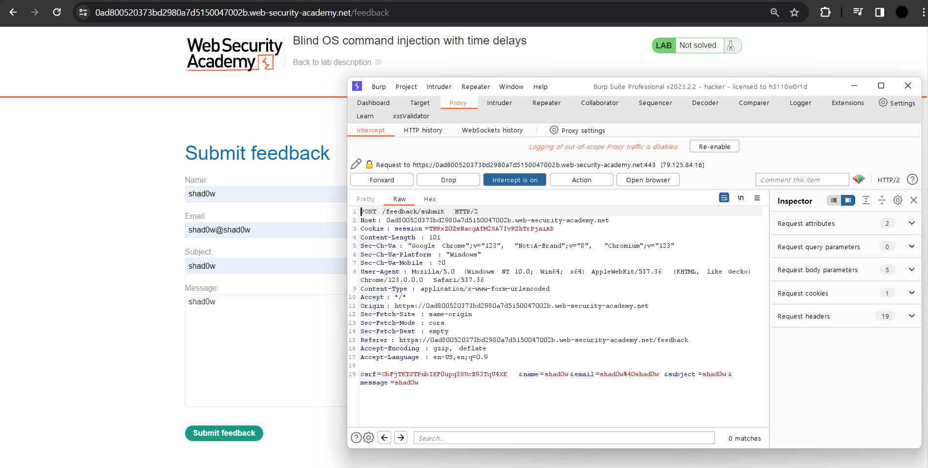 1. I accessed the lab, went to the feedback page, wrote the feedback and clicked the submit button with the proxy turned on.