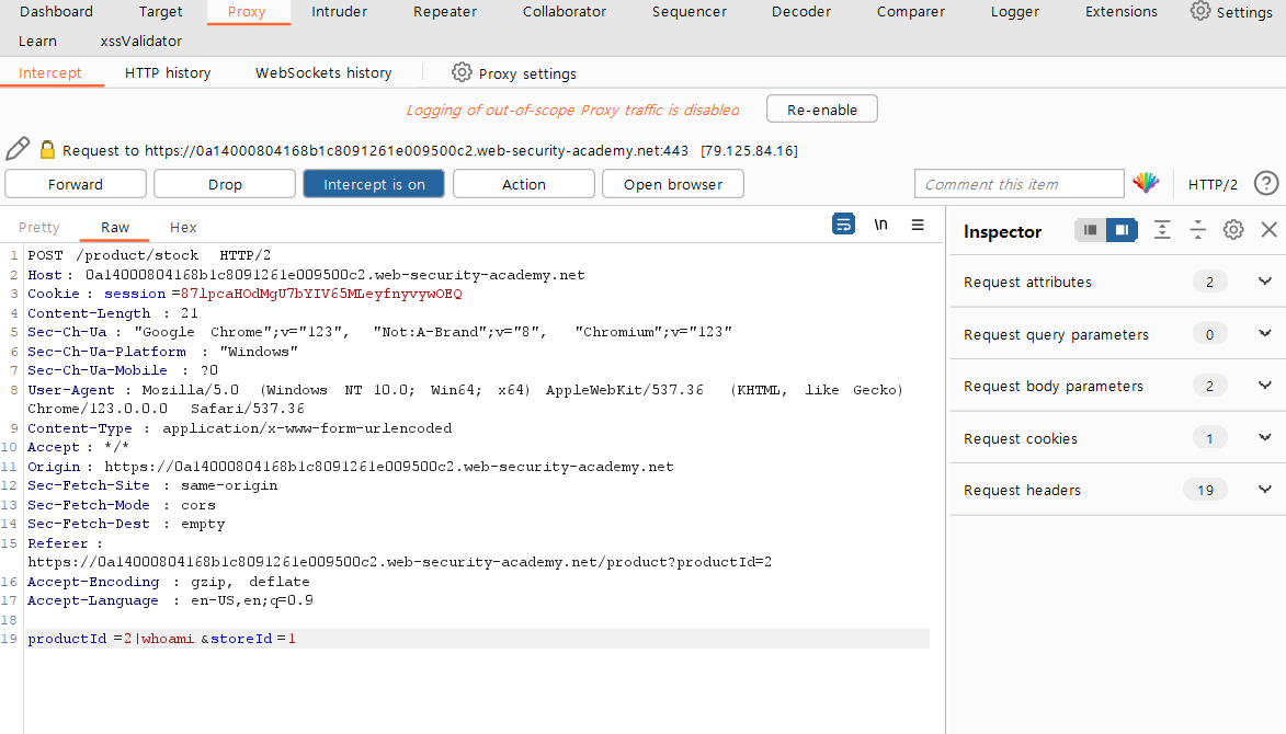 I inserted the "whoami" command into the productId parameter using | and sent a request to the server.
