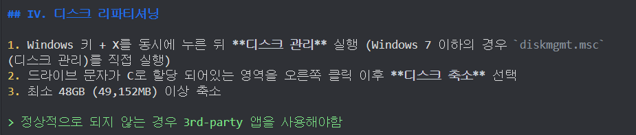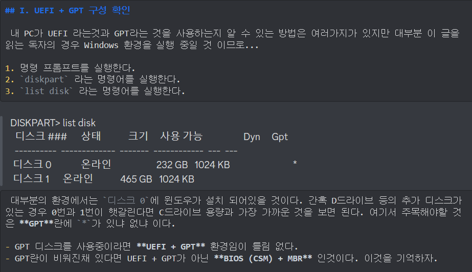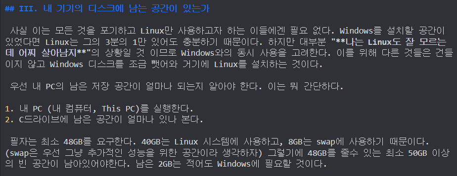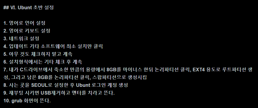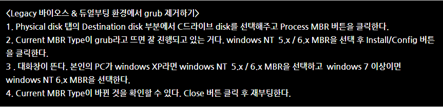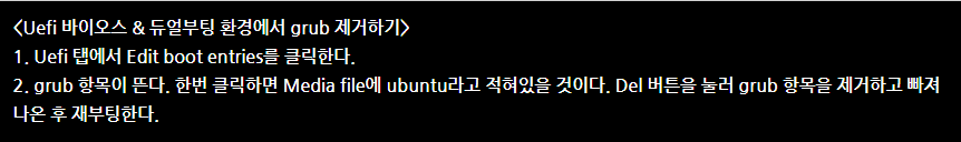 ps. 필자는 듀얼부팅 상태에서 Ubuntu를 제거하다가 Windows까지 날려먹어 grub에서 벗어나지 못한 적이 있다. 심지어 bios의 boot 메뉴에도 windows boot manager가 없었다. 하루 종일 마음고생하다가 선배의 도움으로 간신히 윈도우 복구에 성공했다. 듀얼부팅의 장점도 있지만 시스템 자체에 영향을 미칠 수 있다는 치명적인 단점도 있기에 가상머신을 사용하거나 리눅스 머신을 따로 두는 것을 추천한다.