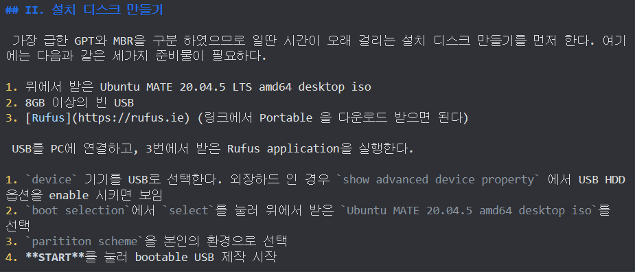 3. Rufus도 최신버전으로 다운로드하자. 그리고 Rufus에서 2가지를 더 설정해줘야 하는데 우선 파티션 구성이다. MBR과 GPT 방식이 있는데 MBR은 오래된 방식이고 GPT가 최신이다. GPT로 설정해 준다. 2번째는 파일 시스템이다. 이것은 Fat32 방식을 선택한다.