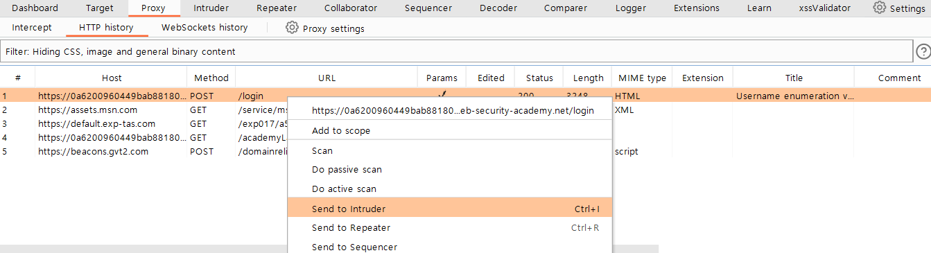 I checked HTTP communication history to check the caught proxy. There was a record indicating the "/login" path. So I send that to intruder.