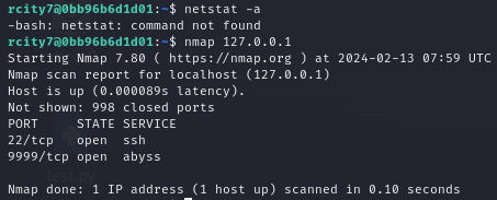 3. I used the "netstat -a" command to check the network connection status, but the "netstat" command doesn't work. Therefore, I scanned the localhost using "nmap", a tool for scanning the network. Of the open ports, port 9999 was suspected.