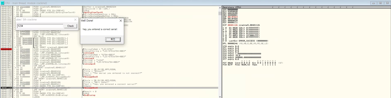 시리얼 값을 "1234"로 이력 후 한 단계씩 디버깅해 가며 CMP에 도달했을 때 EAX의 값을 클릭해 0으로 만들어서 EAX와 0이 일치하게 하여 다음 문장이 실행되고 결과적으로 "Well Done!" 쪽으로 뛰어넘어가 올바른 값이 입력되었다는 창이 뜬다.