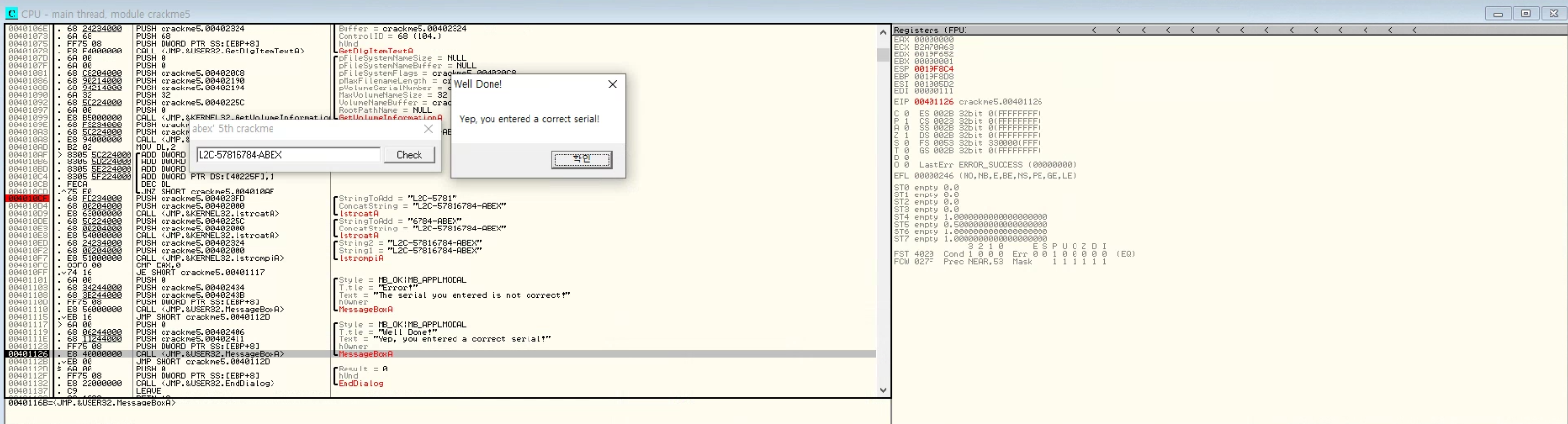 다시 시작해서 " L2C-5791 6794-ABEX"를 시리얼 값으로 넣었더니 올바른 시리얼 값을 넣었다고 뜨고 EAX가 0으로 설정된 것을 확인할 수 있다.