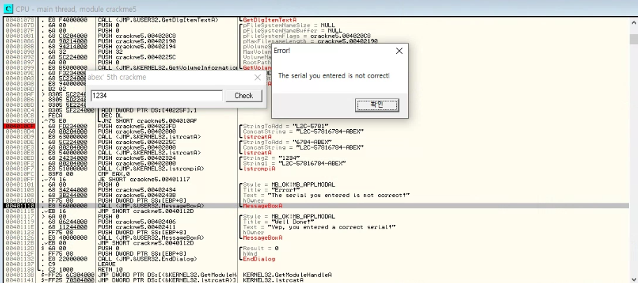 우선 시리얼키를 입력하는 창의 메모리 주소를 찾기 위해 F2로 브레이크포인트 설정을 하고 F9으로 그전단계까지 실행한 다음 F8로 한 단계씩 실행하는 방식을 사용했다.
