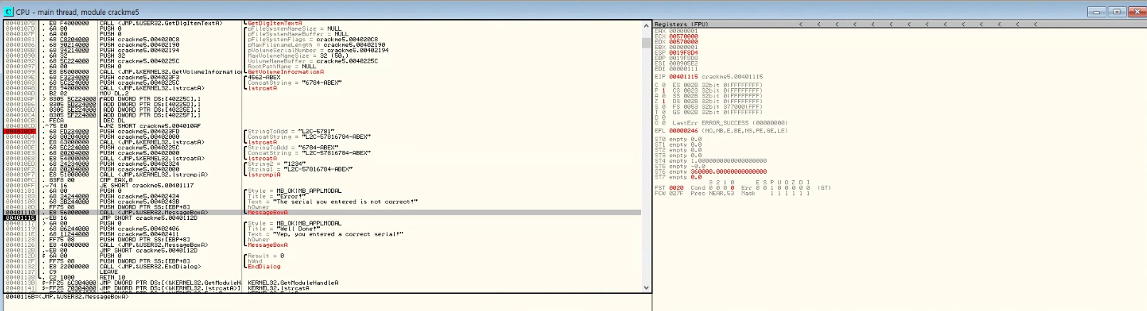 EAX의 값이 0과 같다면 바로 다음 주소를 실행해서 00401117 메모리 주소로 뛰어넘어가 "Well Done!"이라는 메시지 창을 띄우는 것 같다. 따라서 "Well Done!" 메시지 창이 나오게 하는 게 이 문제의 핵심일 것이다.