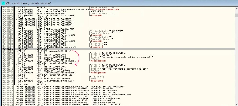 어셈블리어를 분석해 보면 CMP를 통해 EAX와 0을 비교하여 EAX의 값이 0과 같지 않다면(ZF=0) 하나의 메모리 주소를 뛰어넘고 Error 메시지 창을 띄우는 것 같다.